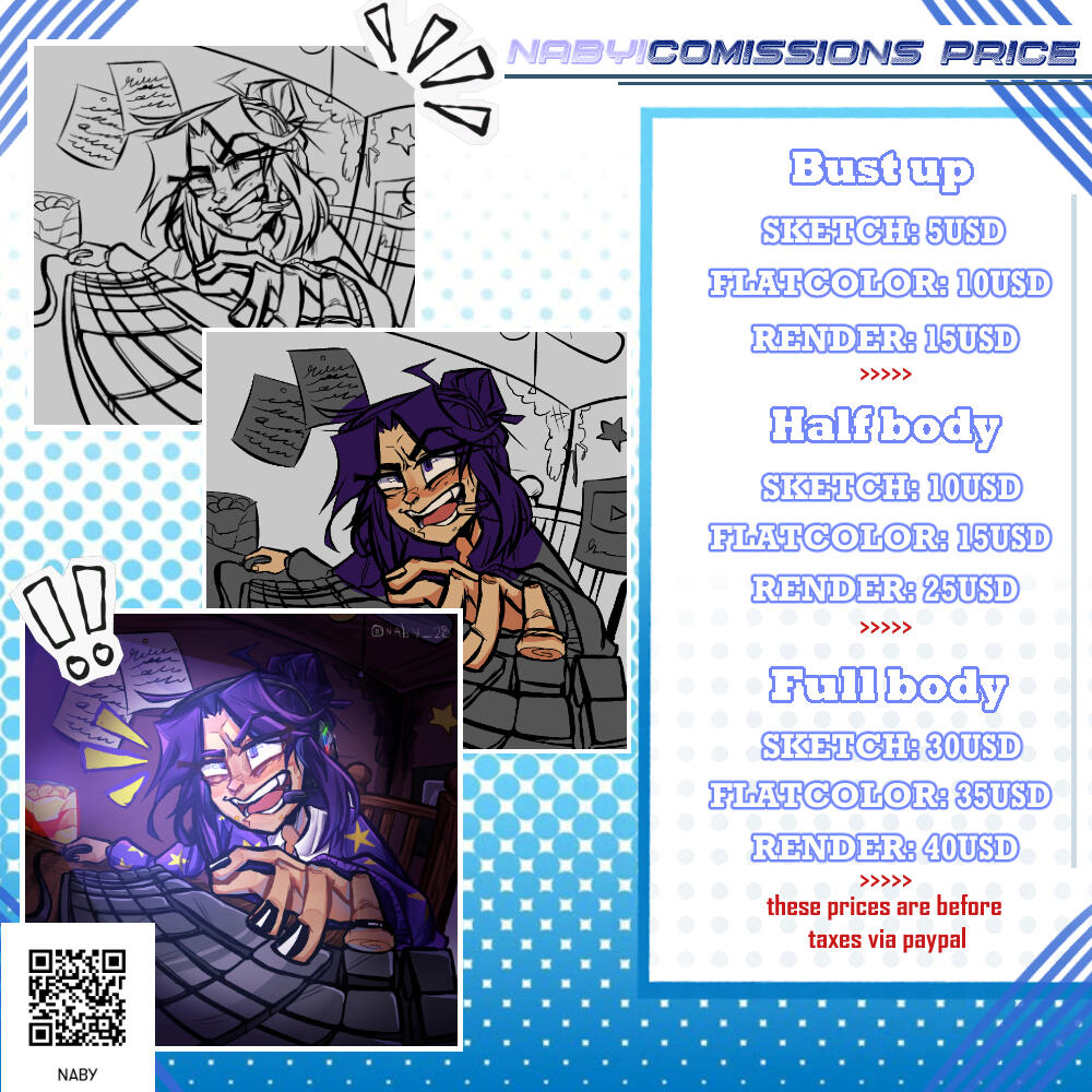 ✶cobro el 100% de las comisiones antes de empezar, esto me ayuda a evitarme problemas con estafadores o parecidos.✶los pagos serán únicamente por facturas de paypal, estas serán enviadas al correo electrónico del comisionador, en caso de ser de Argentina se puede llegar a un acuerdo y hacerlo por deposito a tarjeta.✶no hago reembolsos una vez inicie con la comisión, por favor este seguro antes de hacer la compra de mi servicios.✶si decides cancelar la comisión antes del pago no hay problema con eso, si esta situación llega a suceder por favor avisar con antelación.✶la comision puede tardar entre 2 semanas hasta 1 mes, esto puede verse afectado por la complejidad de la obra o fila actual